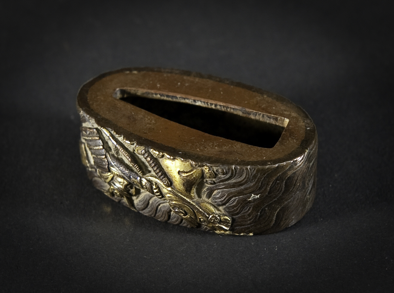 Fuchi (Collar on hilt of sword) | Japanese, 18th Century | metal, gold, silver, copper | 2.2 x 4.8 cm. | Gift of Judge Montague Tyrwhitt-Drake (AGGV 2000.005.003)9. The swordsmith inscribed his signature onto the tang of the sword after completion. Over the centuries, this is an area where one finds forgeries that acknowledge prominent smiths and guilds.