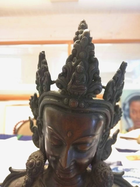 Buddhist iconography can be incorporated in unexpected ways. In the centre of Avalokiteshvara’s crown sits the small Buddha Amitabha – revered as one of the five “self-born” Buddhas that have existed eternally. Avalokiteshvara is the earthly manifestation of Amitabha. This Buddha can be distinguished by the mudra, or hand gesture that he is expressing. Here, Buddha Amitabha is seated in the Dhyana mudra with a begging bowl in his left hand.