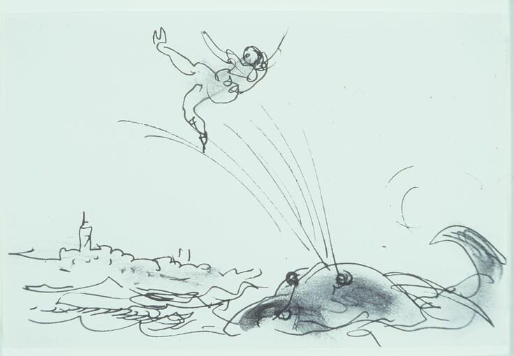 Arthur Lismer (Canadian, 1885 – 1969) | Jonah Spewed Out of the Whale | 1967 | ink | 10.1 x 15.2 cm | Gift of Prince & Princess Abkhazi, Victoria (1974.168.002)