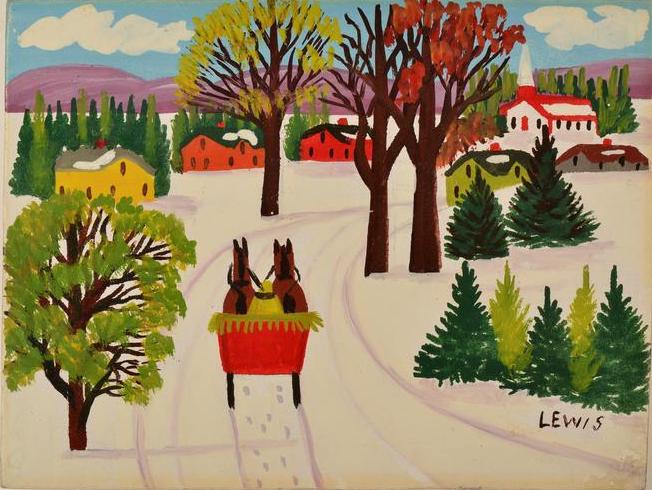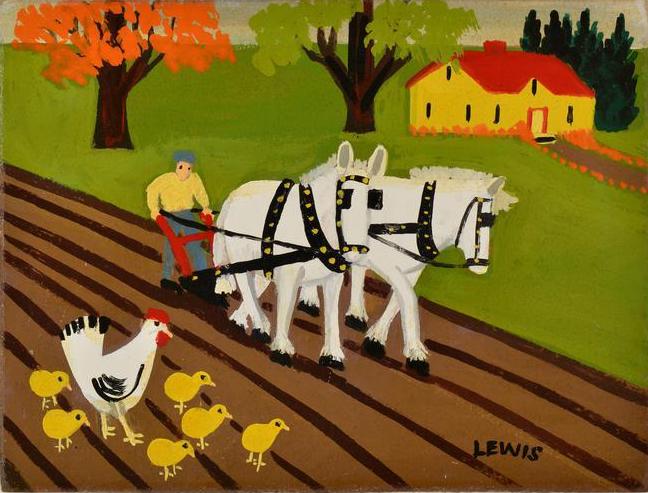 Maud and Everett lived in a tiny one-room house in Marshalltown. As her rheumatoid arthritis grew worse, Everett took care of the house while she painted, first Christmas cards which she sold, then small paintings in oil. Depicting farmyard animals and teams of oxen, deer and birds, as well as the familiar landscapes of her childhood and the village of Digby, Maud was influenced by the simple life that unfolded before her in the Maritimes. The style of naive art in which she painted her subject-matter imbued a sense of simple joy and vibrancy to all her works.