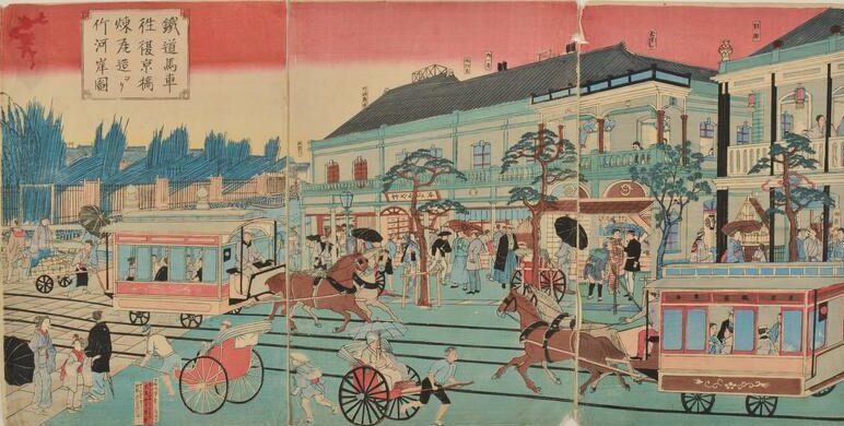 Utagawa Hiroshige III (1842-1898) | Horsecar Runs Between Kyobashi and Takegashi | not dated | woodblock print triptych | 35.8 × 24.2 cm | Ruth-Stanley Asian Art Fund (2019.040.001 a-c)