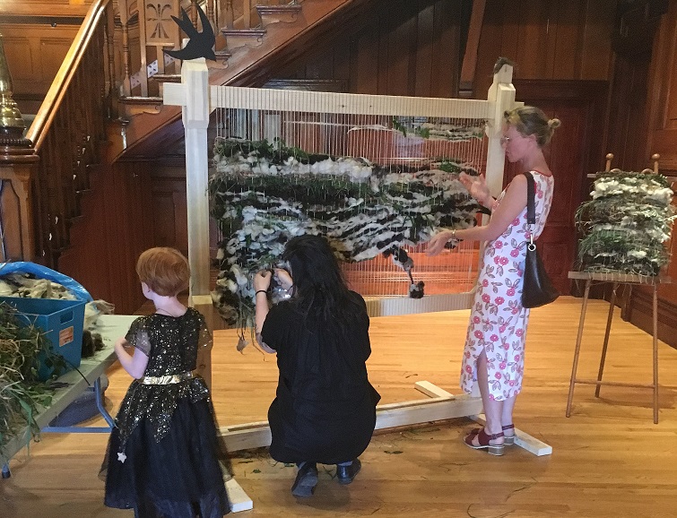 Following on their interest in the interactions of humans and animals, Estraven’s first Family Sunday outing in May saw the collaborative production of a Nesting Material Weaving. The weft is made up of unprocessed sheep fleece (wool), grasses, twigs, moss, lichen and other natural materials. Together, these materials were used by birds to construct their nests and to line tree cavities. The weaving was placed in the Gallery’s courtyard and was well patronized by a flurry of spring nest builders!