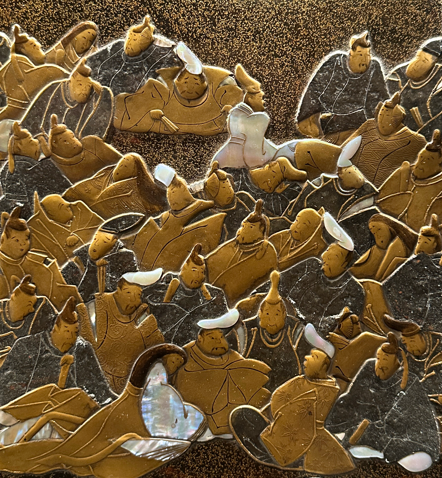 Covering the surface of the lid is a dense gathering of male and female figures dressed in courtly attire associated with the Heian Period (794–1185 AD). Executed in a combination of inlaid mother-of-pearl, pewter, lacquer, and gold, the figures are rendered with lively variation in posture and expression. Their faces are delicately painted, lending individuality to each character. Rather than presenting a single narrative moment, the composition invites close viewing, rewarding the eye with a rhythm of forms and gestures across the surface.