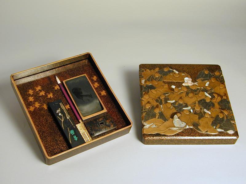 Among these objects, a Japanese lacquer writing box (suzuribako) stood out for its exceptional artistry [MC1.1]and decoration. Titled Lidded Box with Writing Accessories (AGGV 1966.056.001 a–e), the box entered the Gallery’s collection in 1966 as a donation from Fred and Isabel Pollard. While the box conforms to the standard form and dimensions of writing boxes and holds brushes, an ink stone, ink sticks, and a water dropper, its lid is distinguished by a remarkably intricate decorative program[MC2.1].