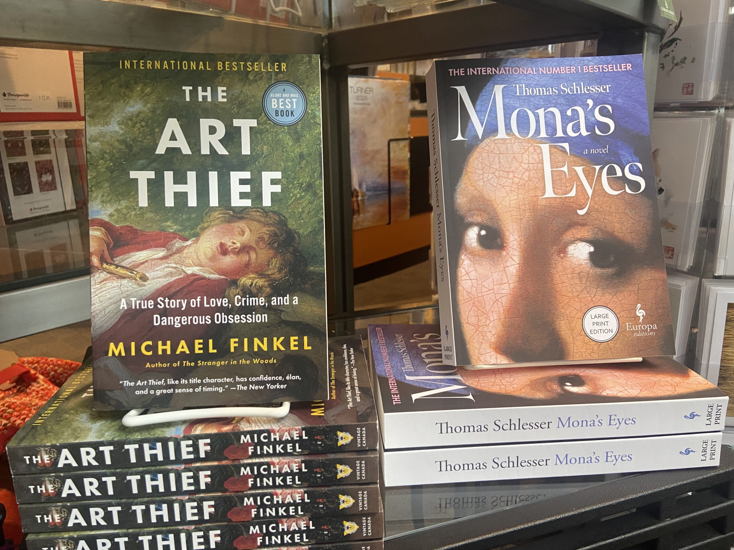 Bestsellers The Art Thief by Michael Finkel and Mona’s Eyes by Thomas Schlesser are perfect gifts for fireside winter reading.