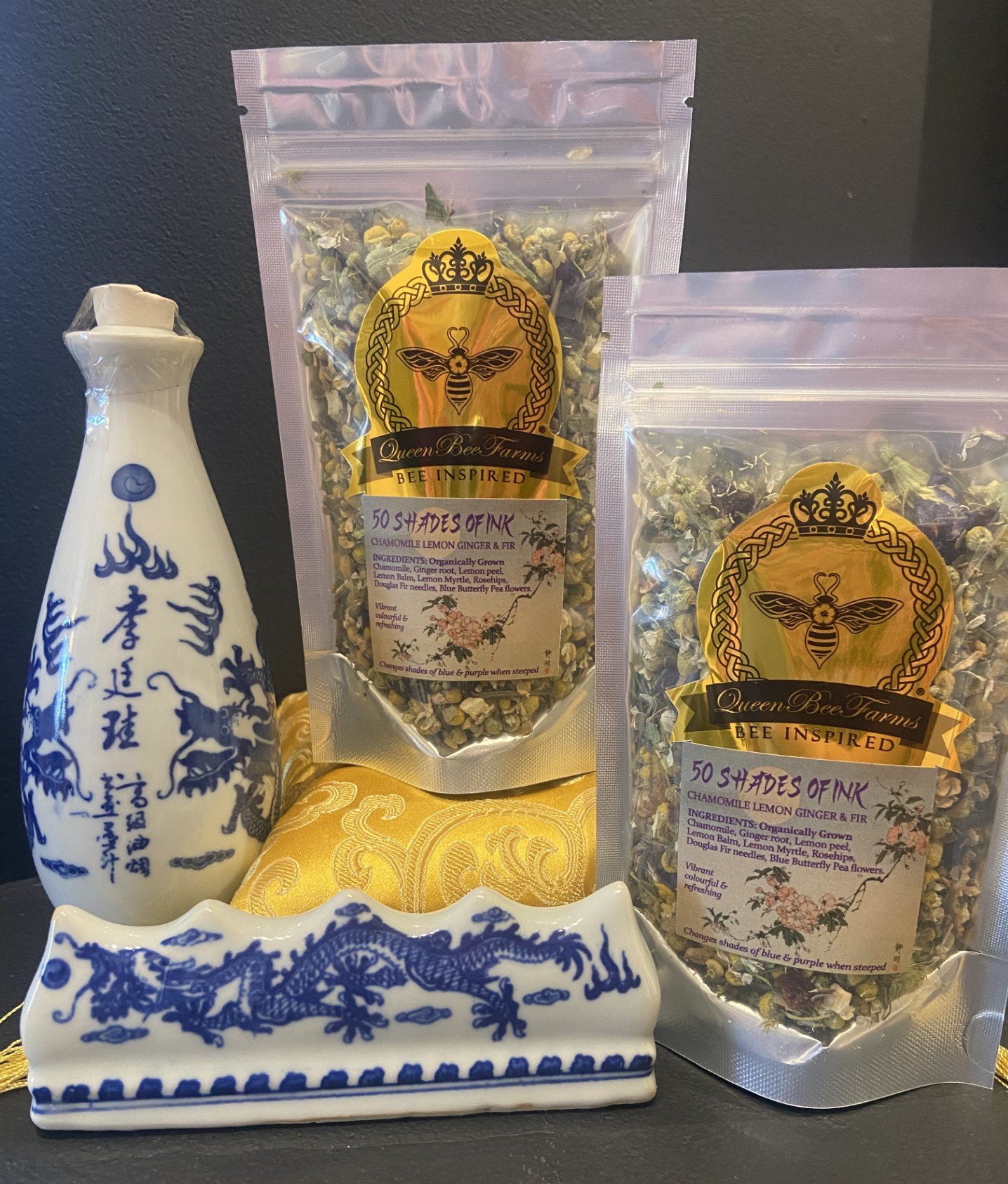The new custom tea blend from Queen Bee Farms, 50 Shades of Ink. Beauty meets flavour for moonlit nights while painting for pleasure.