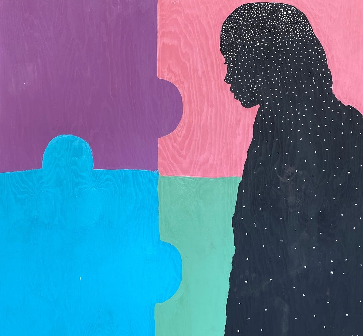 As the girls explored these themes through design and colour, the idea of individual silhouettes took form. The silhouettes reference traditional portraiture, however they could also be seen as shadows that make us question what can be seen or not seen when we face others. Most of the silhouettes are intentionally black to represent how children of colour continue to be marginalized, cast in categories of difference, and othered by societal practices. The graphic backdrops, or puzzle pieces form a literal ‘fitting together” depicting intersections of contact, voiced by contrasting colour and soft repeating pastels to show how ‘colour’ when fully expressed, does not clash. The girls worked on the panels together, in fluid teams, helping each other build their unique piece with the knowledge that they would all join together as one voice, connected by their unique expressiveness.