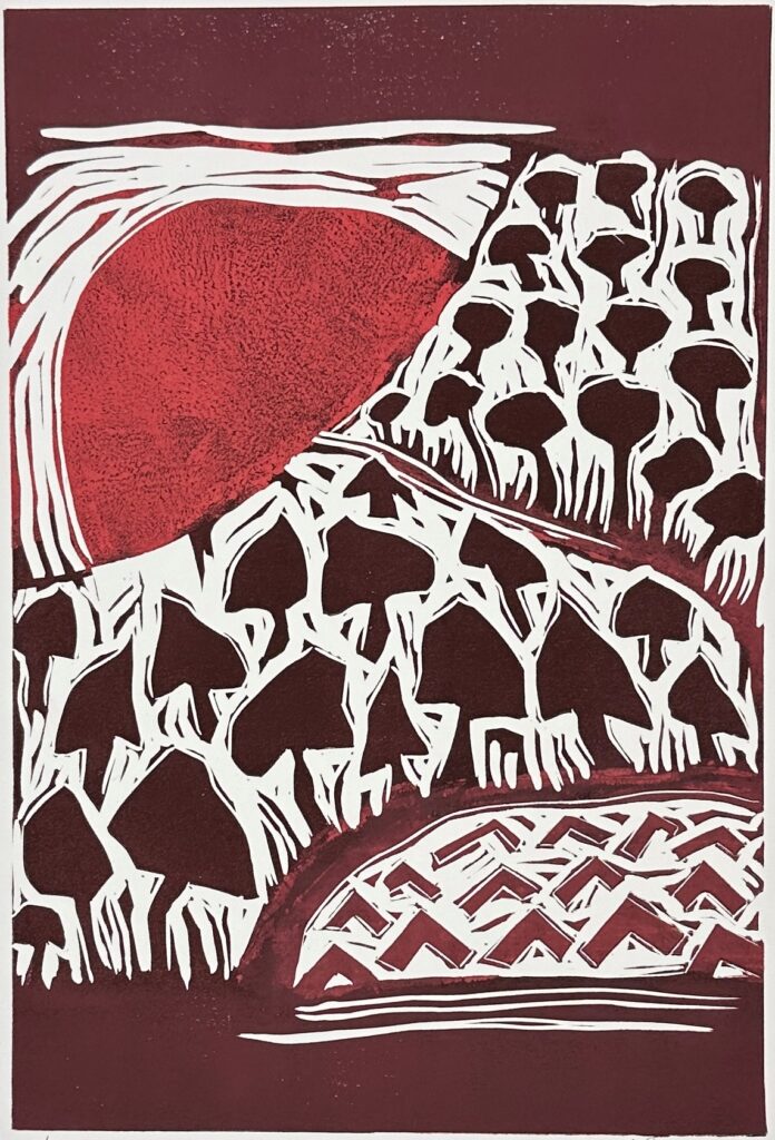 “I’m in my element in the studio, carving and printing linocuts. The work is physical and intuitive … a conversation between hand, tool, and material. Each print carries the mark of both precision and imperfection.”