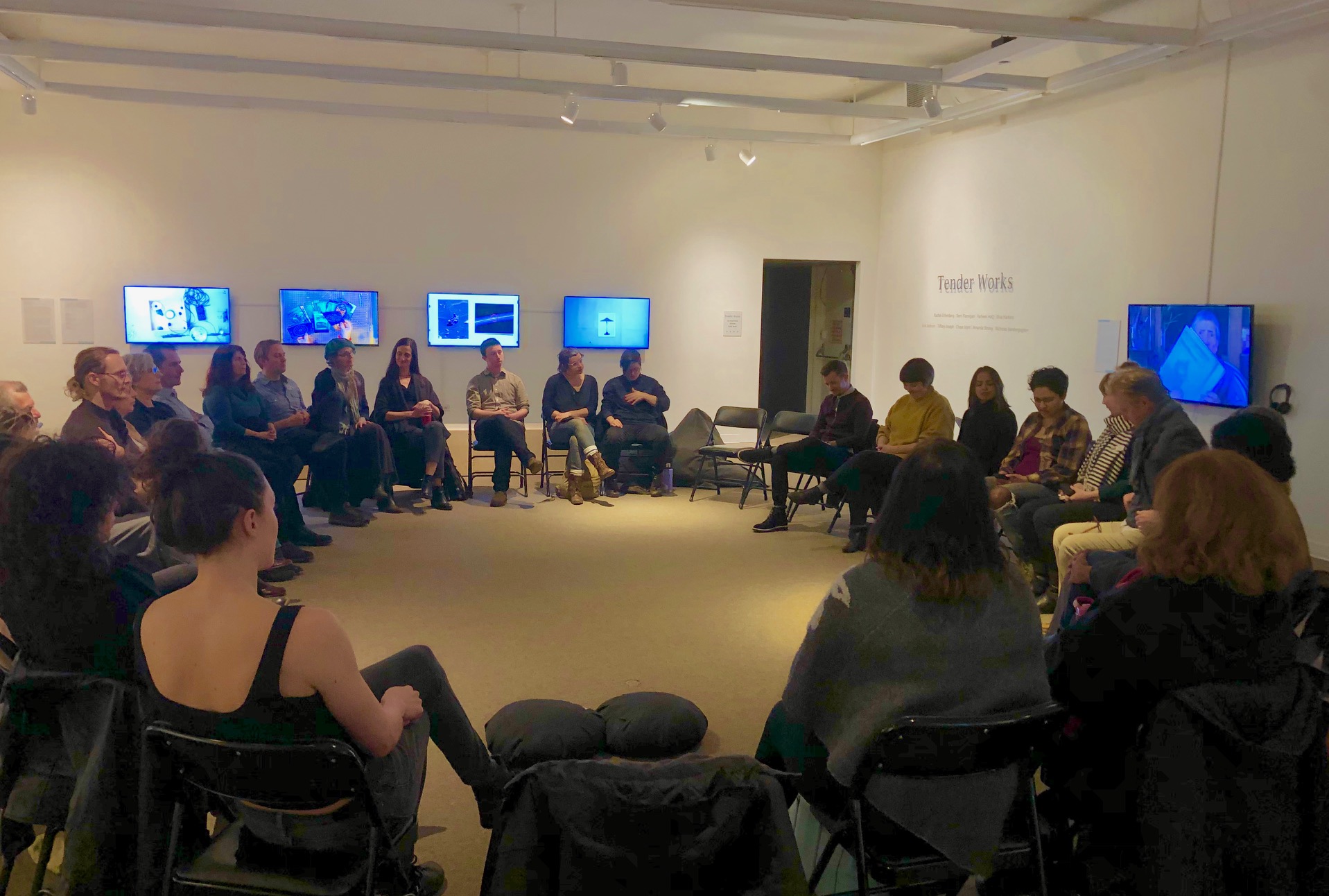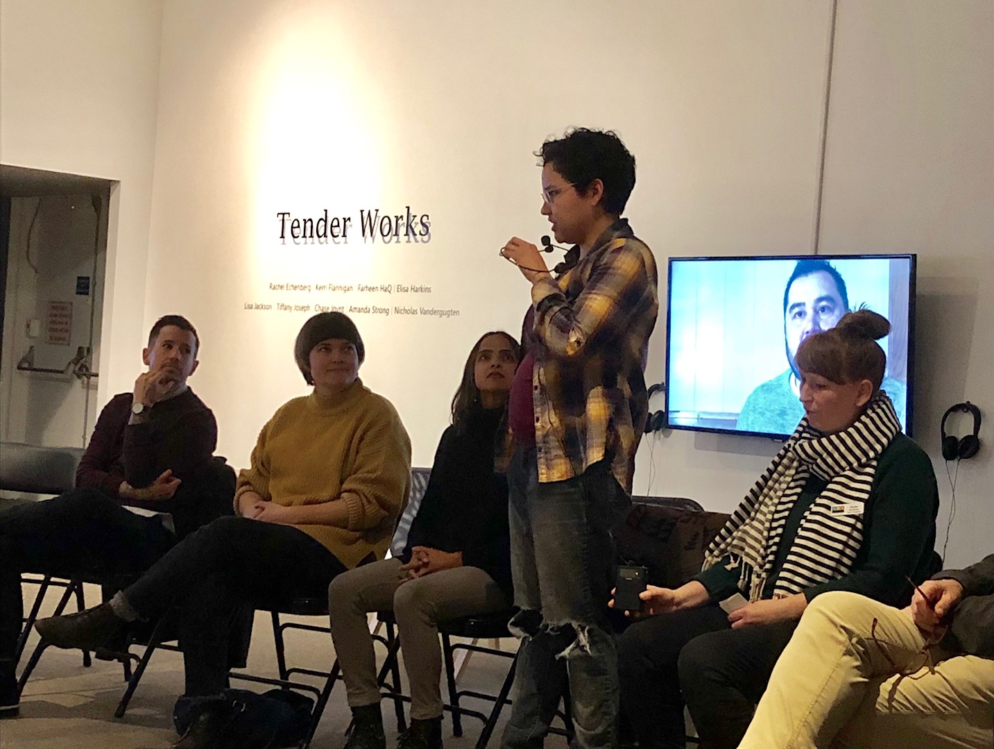 Gathered in the Tender Works exhibition gallery in a large circle were the artists – Tiffany Joseph, Farheen HaQ, Kerri Flannigan and Chase Joynt – their friends and other visitors, several of whom came as family units. The family, as well as one’s lineage, was a pertinent theme of the evening, even as the question posed to the artists related to the exhibition title: Where does the tenderness come from?