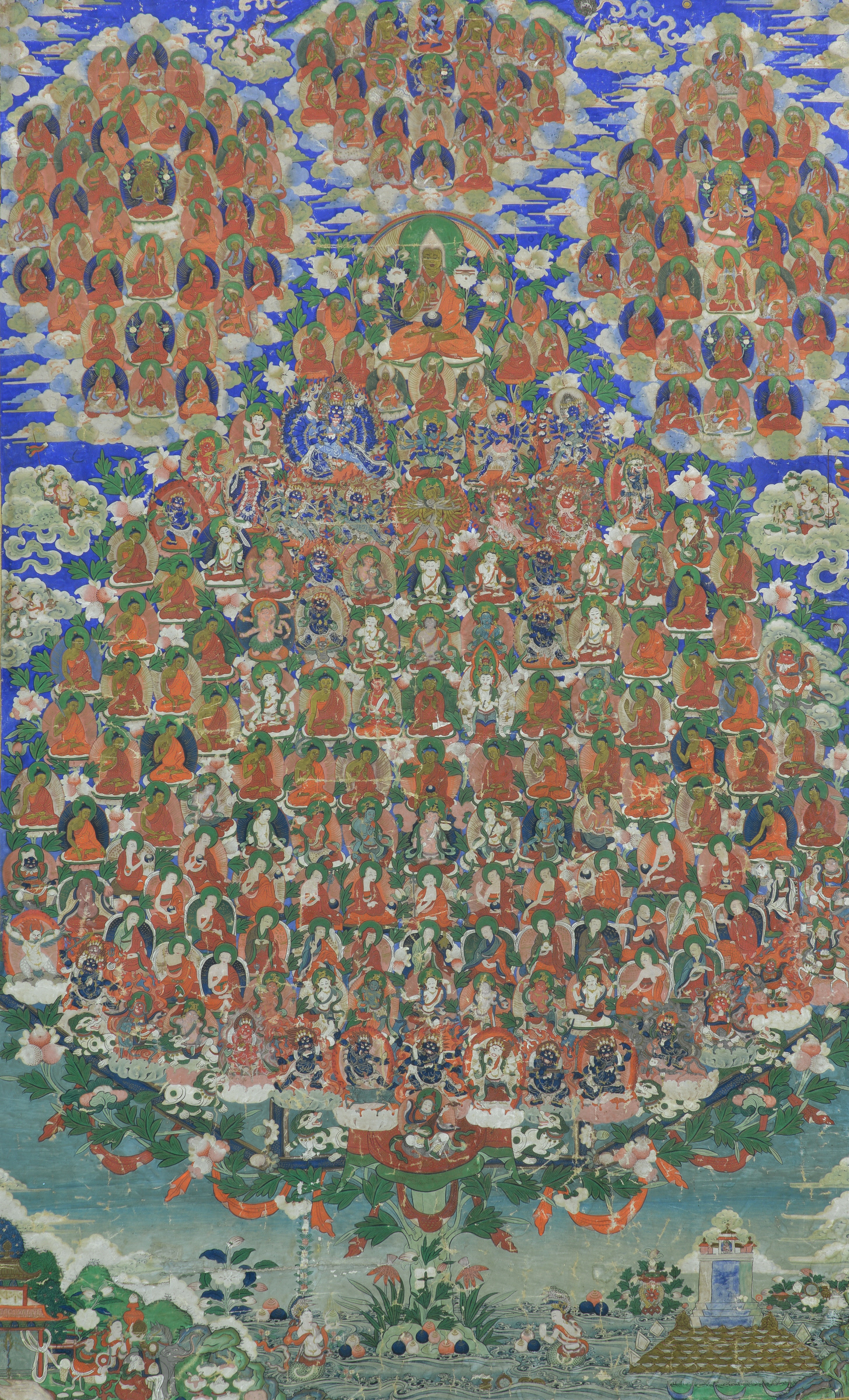A thangka is a Tibetan Buddhist painting on cotton or silk that depicts a scene or a Buddhist deity. Thangkas vary in size and are usually kept rolled up, rather than hung for display like a Western-style painting. Usually commissioned by an individual or a family, the thangka is used for meditation or instruction, at which point, the rolled-up scroll would be ceremoniously unfurled to be examined.