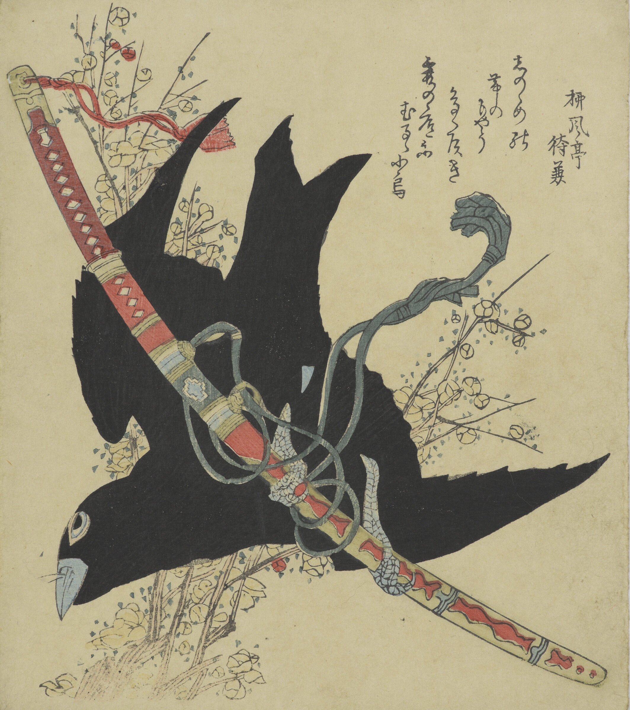Katsushika Hokusai (Japanese, 1760 – 1849) | Surimono of a Crow and Sword | woodcut | 21..5 x 18.6 cm. | Gift of Judith Patt (SC1377)