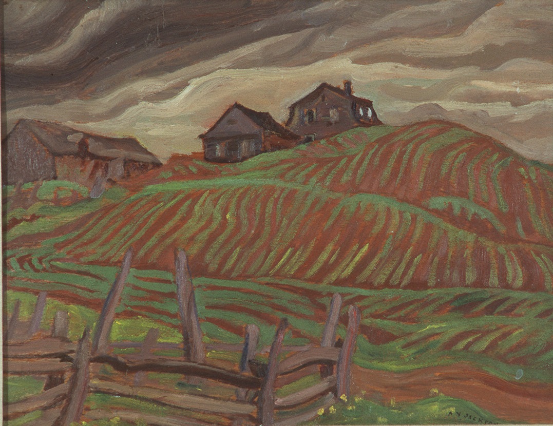 Brushwork in art terminology refers to the textures created by the artist’s brush and the technique of handling. It describes the opaque textures of the paint and the particular way of handling, but is at the same time, independent of any representational function. During the Modernist period, the bold brushwork is seen as an expressive tool that creates atmosphere and feeling, as is the case in A.Y. Jackson’s painting of fields and a stormy sky.