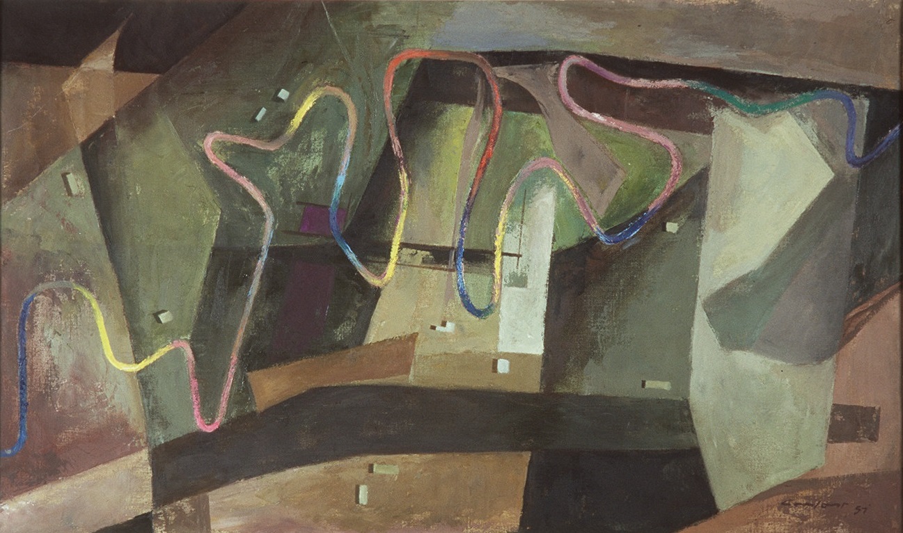 Abstraction in art is a visual language that uses line, colour, form and composition that are non-representational or independent to a certain degree of any reference to the world. Abstract art originated in the late 19th century in Europe as a departure from the Academic style of painting. Many movements emerged from this desire to express visual culture in alternative ways – Fauvism, Cubism, Expressionism, to name a few. The painting below by Charles Fraser Comfort appears as a flat surface of colour blocks and a colourful rope, but the title tells us to look more carefully. The aerial perspective creates a new visual narrative.
