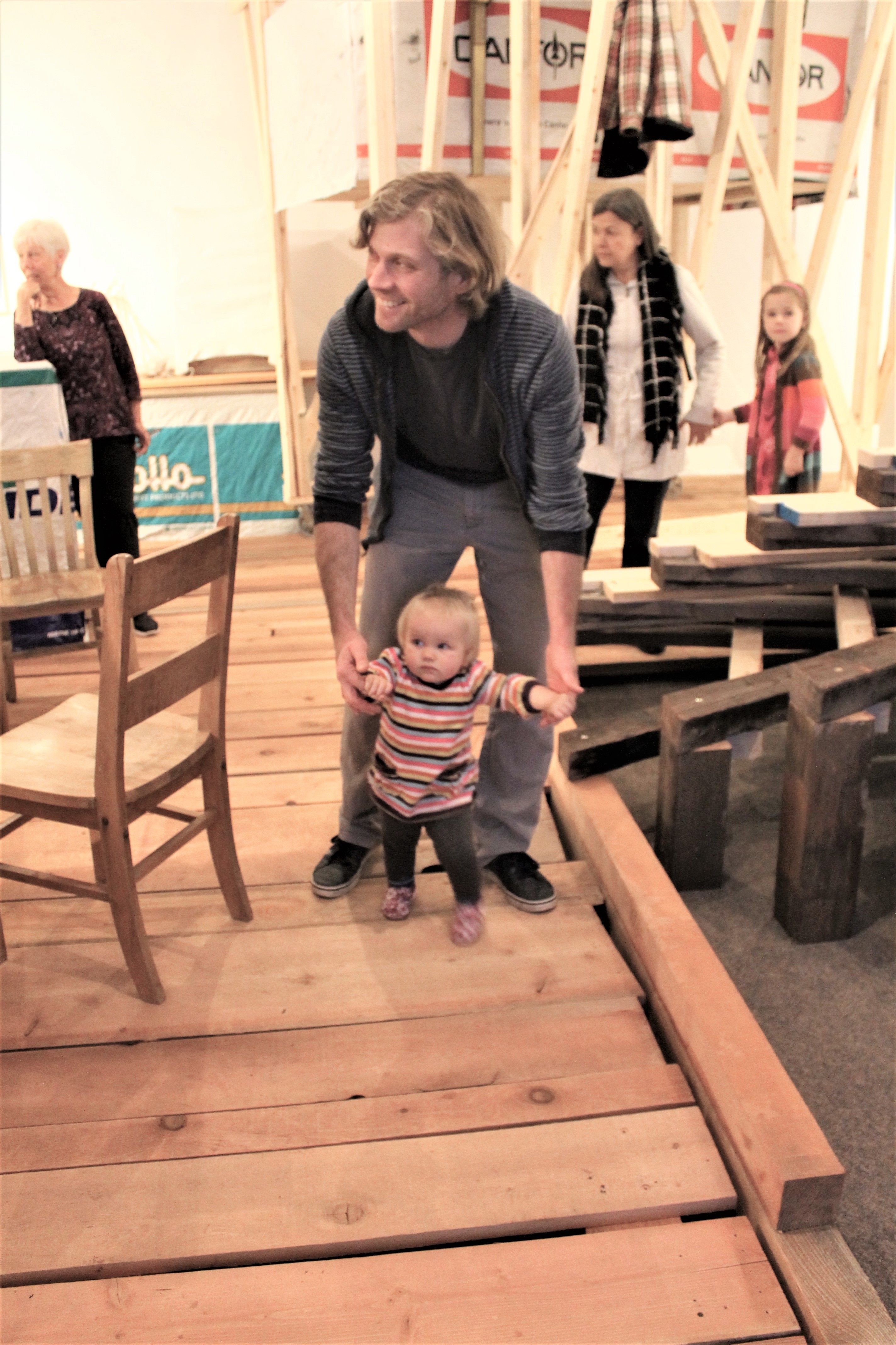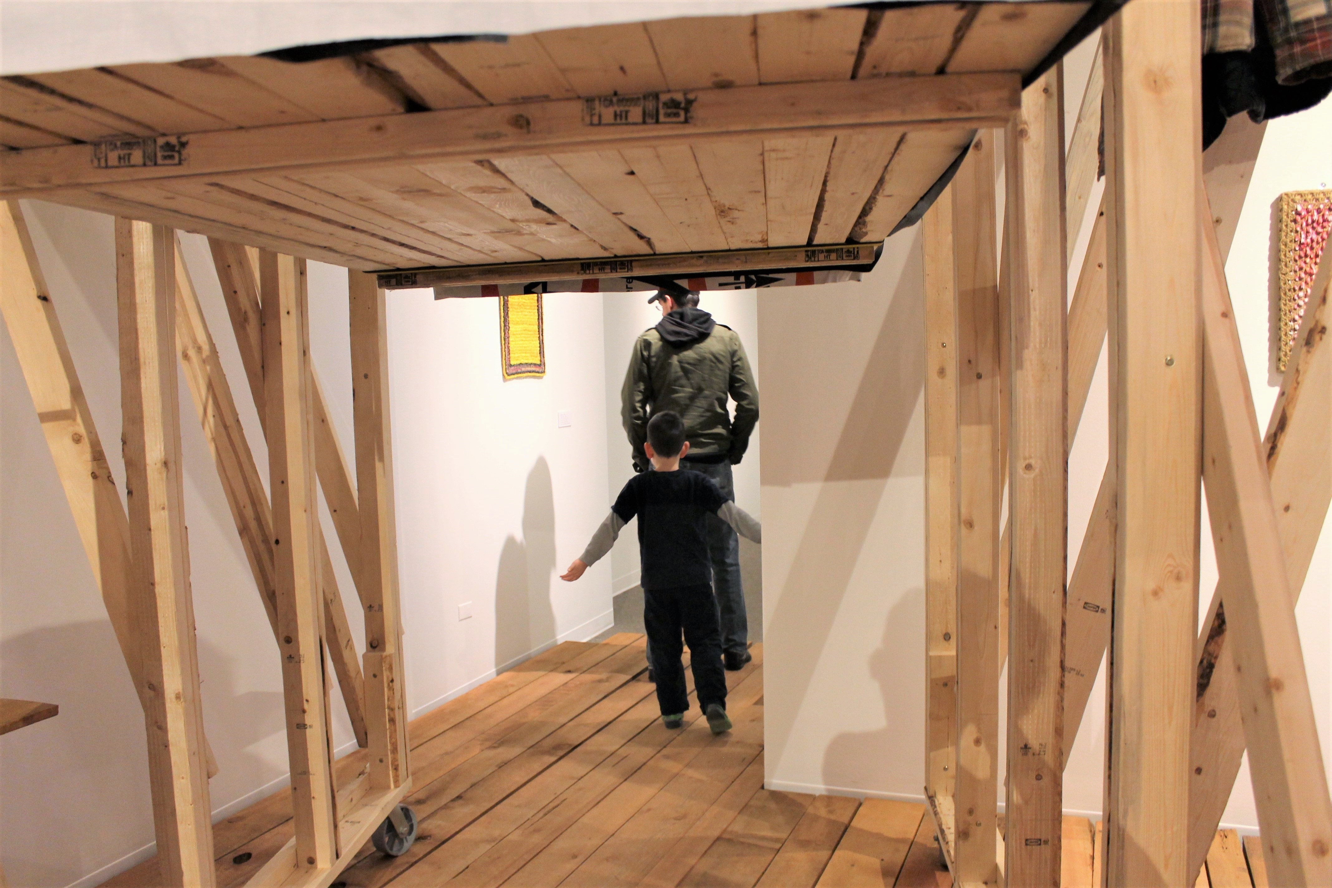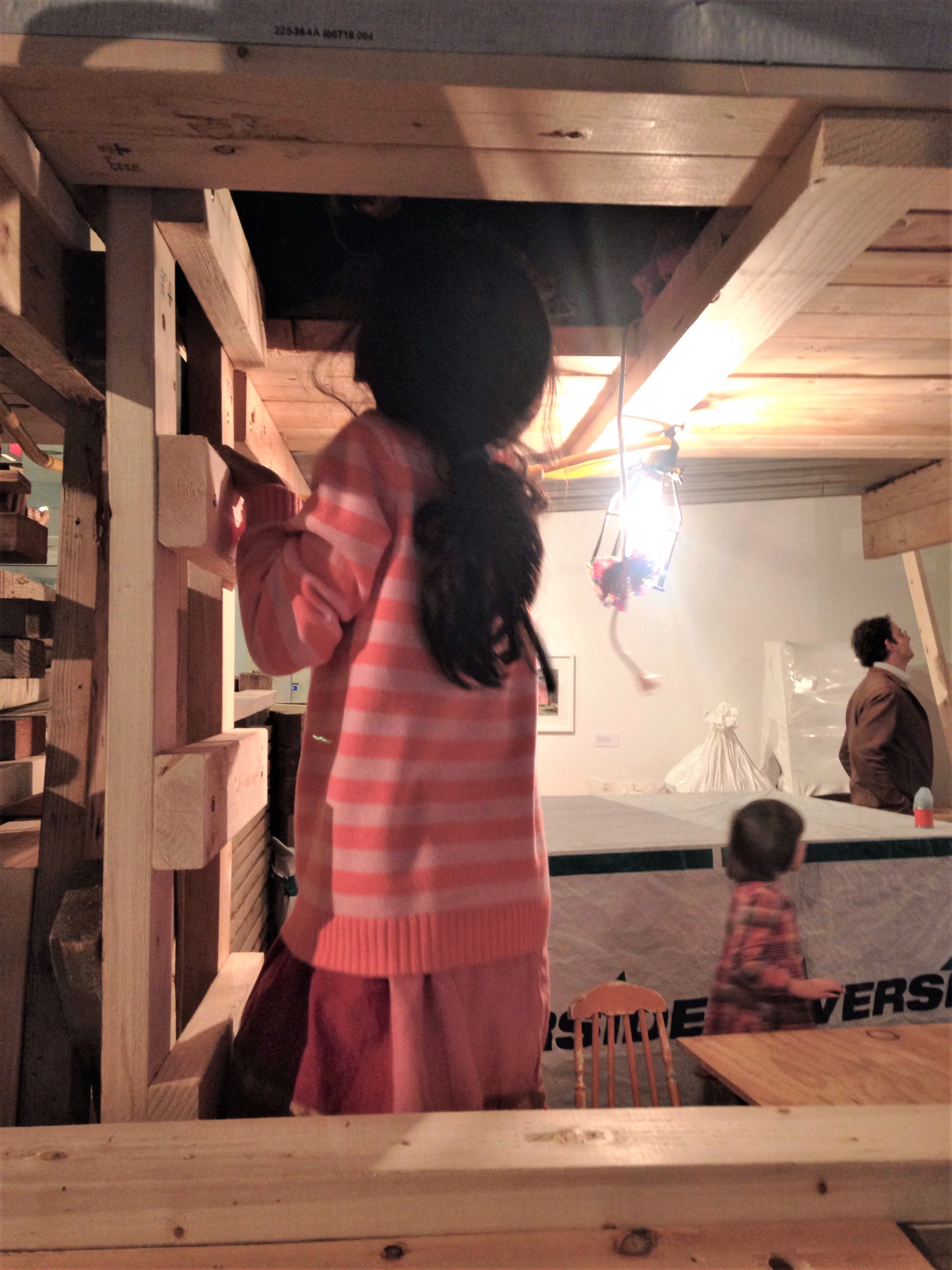 The Best Laid Plans not only invites interaction but was expressly built with that purpose in mind. Pieces of the installation are moveable, a small door has been created to go under the stairs and the loft is easily reached by a ladder. No less than six children piled into the loft, squealing with joy – this piece was the ‘mother of all forts’ on Family Sunday!