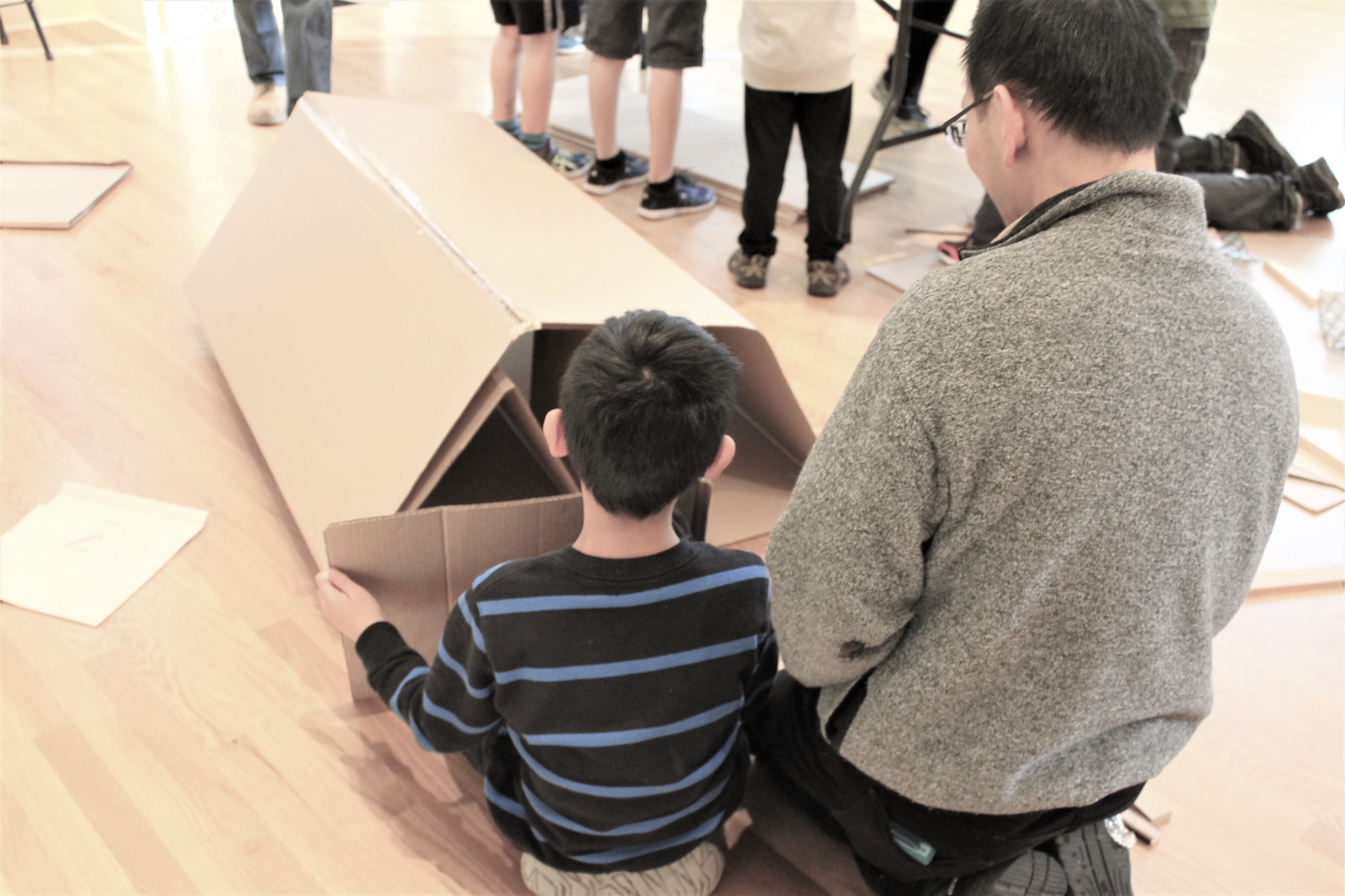 There was also an array of exhibition-inspired activities that encouraged families to transform everyday objects into new things by using collage, tissue transfer painting, weaving and sculpture. A ‘construction’ station was set up where kids were provided with wooden blocks, cardboard and tape to create their own ‘installation’ work.