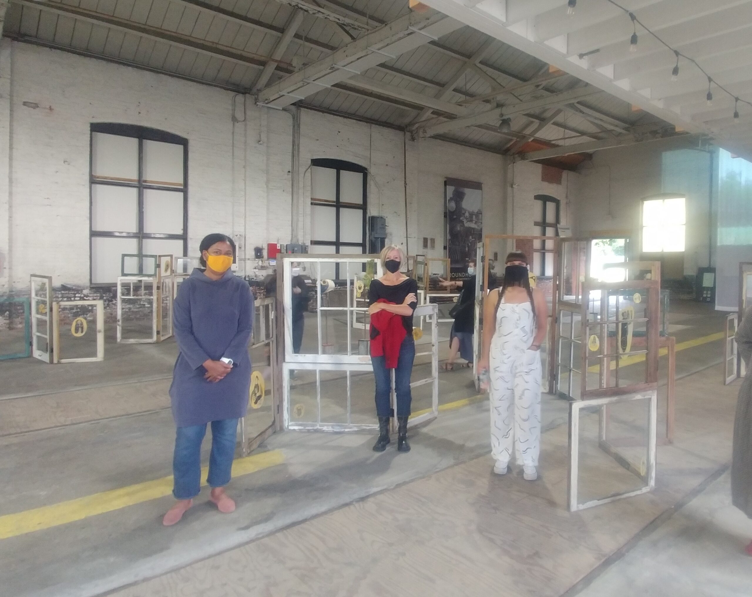 This past summer, from August 20 – 30, artists Connie Michele Morey and Taryn Walker created a site-responsive exhibition in the car shop of the Roundhouse at Bayview Place in Vic West. While COVID-19 restrictions require social distancing that typically prevents us from gathering, we were able to open The Breathing Wall on a beautiful summer evening in Victoria, as the sprawling space of the Roundhouse building meant that the AGGV could host a preview and, a few days later, an artists’ talk, albeit with careful monitoring of numbers and strict adherence to the 2 meter rule.