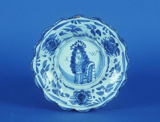 Delftware dish with Portrait of King William of England (1699-1702) | European, 17th Century | 21.7 cm. across | Gift of Mrs. Montague Bruce (1985.025.012)