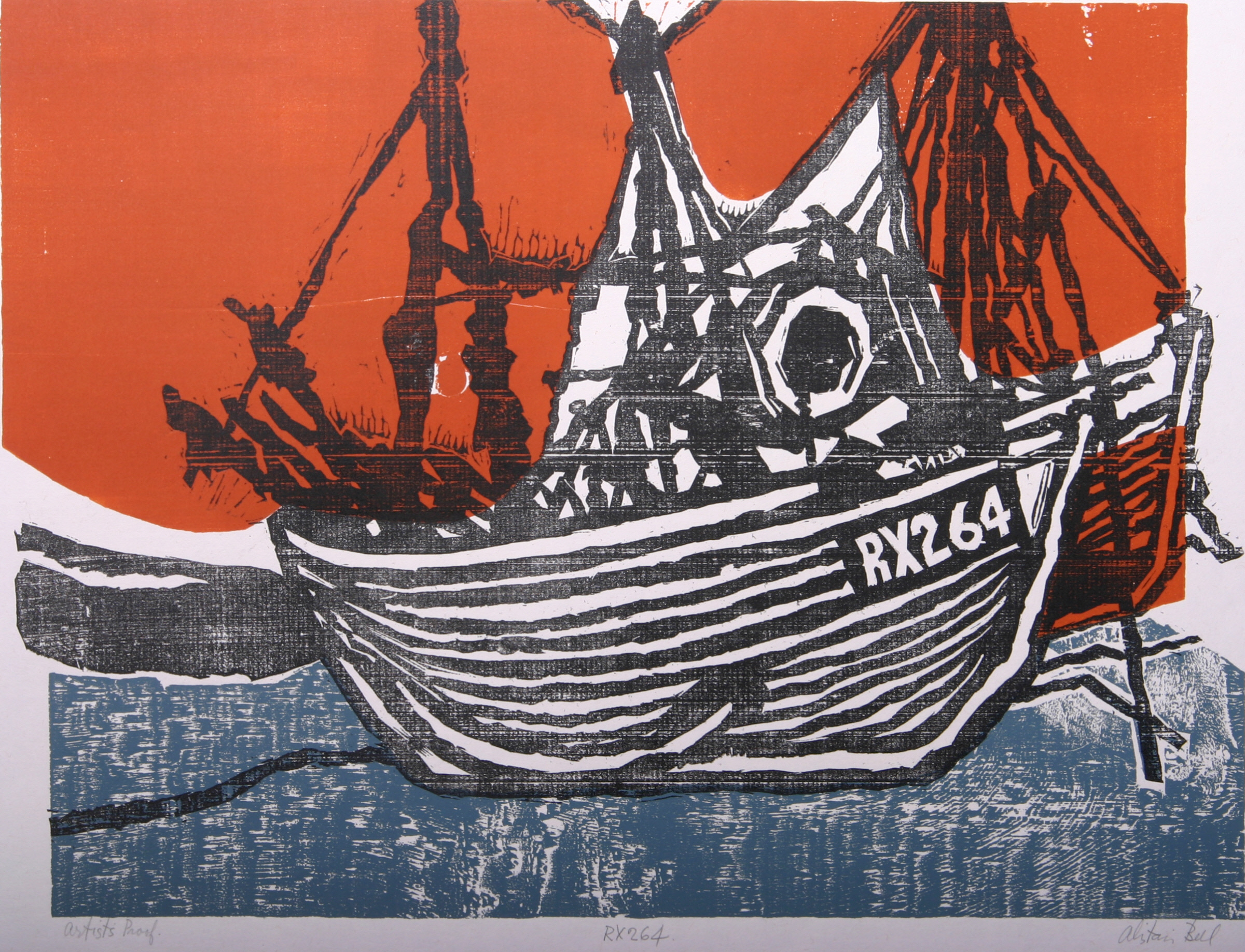 The AGGV has a large collection of prints by one of Canada’s foremost printmakers, Alistair Macready Bell (1913-1997), donated to the Gallery by the artist in 1982. Among them are several of fishing vessels at sea and docked at port around Vancouver, where he lived and worked from 1929 until his death. As a student of the Vancouver School of Art in his youth, he learned to make prints. Originally from England, Bell worked as a draftsman in a structural steel plant before becoming a full-time artist in 1967. His specialty was in the graphic arts, and his works demonstrate his dexterity in lithography, etching, woodcut and wood-engraving.
