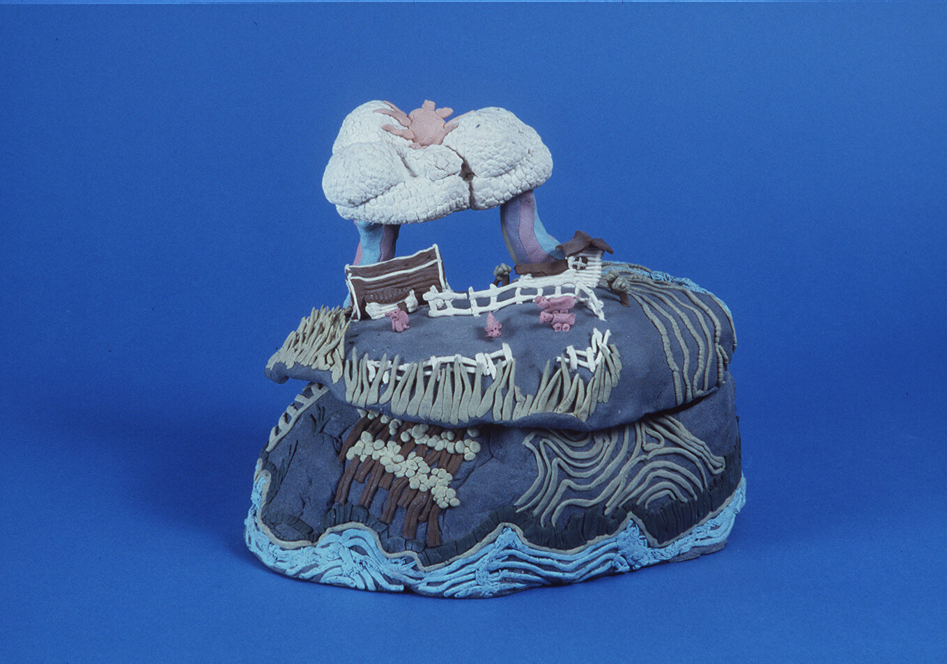 First up is a fantastical cookie jar by Valerie Pugh – an artist originally from Calgary who moved to the West Coast in 1976, where she joined a studio working with other female artists from the Vancouver Women’s Interart Society. Pugh became well known for her small ceramic environments, where she sculpted elaborate scenes and facades exploring and contrasting “farm art” with iconic city structures, like the renowned Ted Harris Paints Shop formerly located in Hastings, Vancouver, or the well-known Emily Carr House, found on Government Street in Victoria. In 1981 Pugh participated in a two-person exhibition at the AGGV with Bill Rennie, titled, Ceramic Sculpture.