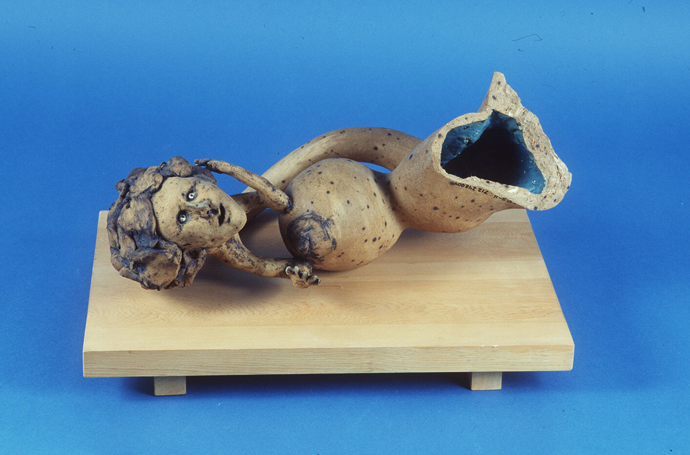 Next up is a whimsical ceramic figure by David Toresdahl – an artist born in Austin, Minnesota, who moved to Vancouver Island in the 1980s. Toresdahl became known for his dark comic style, and ceramic assemblages, which would travel in exhibitions throughout BC and Ontario. His work was also exhibited in the Massey Sales Gallery at the AGGV in a show which included over 100 small-scale ceramic heads. Toresdahl’s partner, Louise Bohun, says about his work in a Times Colonist article by Robert Amos, “Almost everything is a self-reflection, if not a direct self-portrait.”